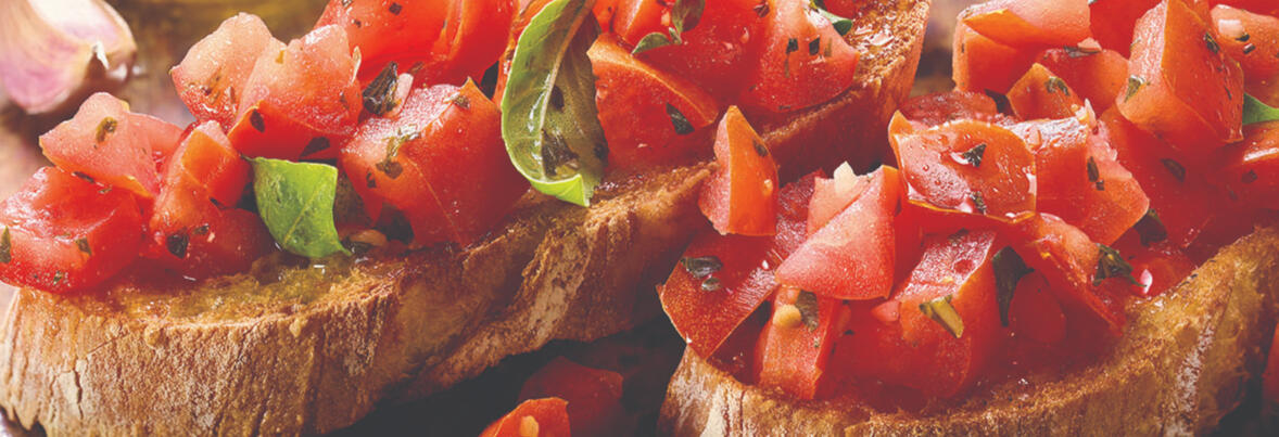 Our bruschetta is full of authentic Italian flavors: ripe Roma tomatoes enhanced with garlic, olive oil, and a bouquet of fresh herbs including basil and oregano. Perfect for any occasion!